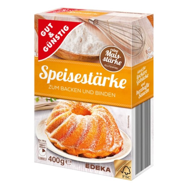 GG Kukuřičný škrob 400gKukuřičný bezlepkový škrob je ideální na zahuštění omáček a zjemnění pokrmů. Hodí se k přípravě koláčů, dortů, náplní, dezertů a ovocných omáček.