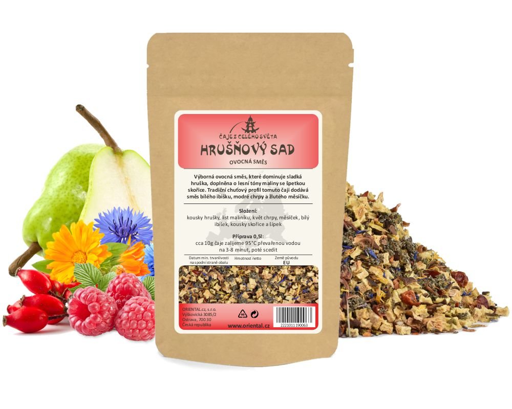 Výborná ovocná směs, které dominuje sladká hruška, doplněna o lesní tóny maliny se špetkou skořice. Tradiční chuťový profil tomuto čaji dodává směs bílého ibišku, modré chrpy a žlutého měsíčku. Neobsahuje žádné přidané konzervanty a barviva.Složení: kousky hrušky, list maliníku, květ chrpy, měsíček, bílý ibišek, kousky skořice a šípek.Doporučená příprava 0,5 litru čaje: