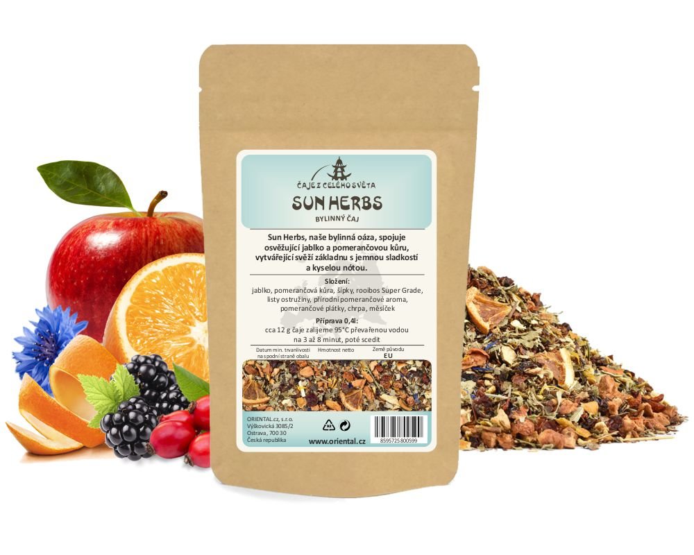 Sun Herbs, naše bylinná oáza, spojuje osvěžující jablko a pomerančovou kůru, vytvářející svěží základnu s jemnou sladkostí a kyselou nótou. Šípky a rooibos přidávají bohatost s hladkou a lahodnou základnou pro chuťové buňky. Přírodní pomerančové aroma, pomerančové plátky a modrá chrpa vytvářejí výrazné pomerančové tóny, zatímco měsíček dodává něžný dotek elegance. Sun Herbs je okouzlující směs, která oslní vaše smysly každou lžičkou.Složení: jablko, pomerančová kůra, šípky, rooibos Super Grade, listy ostružiny, přírodní pomerančové aroma, pomerančové plátky, chrpa, měsíček.Doporučená příprava 0,5 litru čaje:cca 12 g čaje zalijeme 95°C převařenou vodou na 3 až 8 minut, poté scedit.