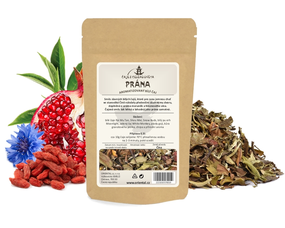 Směs slavných bílých čajů, které pro svou jemnou chuť ve starověké Číně náležely především císařskému dvoru, doplněná o přírodní aroma meruněk a hroznového vína. Čajová směs tak lehká a lahodná jako prána samotná.Složení: bílé čaje Pai Mu Tan, Shou Mei, Snow Buds, bílý pu erh Moonlight, zelený čaj White Monkey, plody goji, kůra granátového jablka, chrpa a přírodní aroma.Doporučená příprava 0,5 litru čaje:
