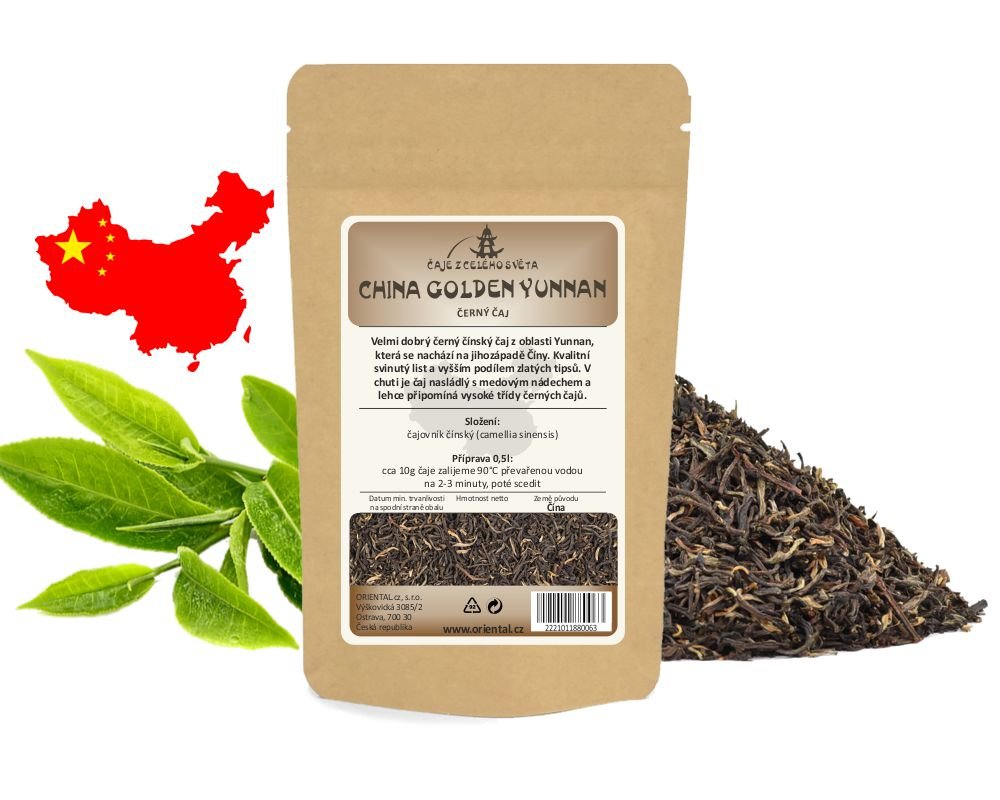 Velmi dobrý černý čínský čaj z oblasti Yunnan, která se nachází na jihozápadě Číny. Kvalitní svinutý list a vyšším podílem zlatých tipsů. V chuti je čaj nasládlý s medovým nádechem a lehce připomíná vysoké třídy černých čajů. Provincie Yunnan (také zkráceně Dian) se nachází na jihozápadě Číny a je rodištěm slavného čaje Pu Erh. Ten v čajové produkci dominuje i z toho důvodu, že se na jeho výrobu používají hlavně listy z velkolistého yunnanského čajovníku. Relativně nedávno (30. léta 20. století) se zde začal produkovat také černý čaj a vznikly vynikající čaje jako Golden nebo Pine Needle.Příprava 10g čaje v 0,5l konvičce: