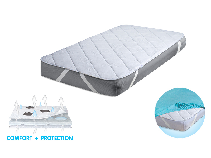 Gumy pozycjonujące umiejscowione w czterech rogach podkładu, zapobiegają bezwiednemu zsunięciu się z materaca pod prześcieradłem podczas snu. Nadaje się do zastosowania na każdą wysokość materaca. Warstwy podkładu to: