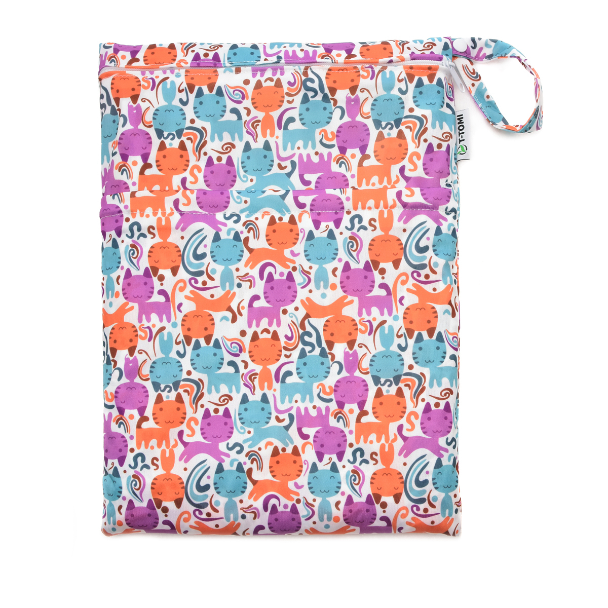 Nepromokavý sáček T-TOMI je vyrobený ze 100% polyesteru s PUL zátěrem. Díky dvěma velkým kapsám se zapínáním na zip a praktickým uchem s patentkou se stane Vaším nepostradatelným pomocníkem nejen doma ale i na cestách. Je vhodný nejen pro mokré pleny, ale i pro plavky, ručník, osušku, dudlík, deštník či jiné všestranné využití.