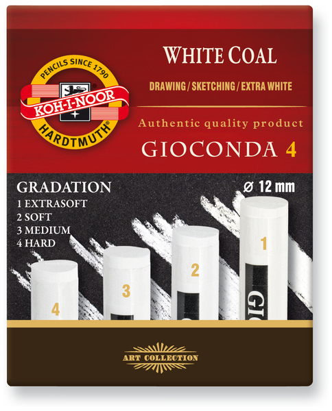 Biały węgiel prasowany. Doskonały do swobodnych, ekspresyjnych prac graficznych i szkiców niewymagających odwzorowania wielu szczegółów. Sprawdza się w rysunkach na dużych formatach.- Gioconda biały węgiel prasowany - Zestaw zawiera 4 sztuki węgla w twardościach: 1, 2, 3 číst celé