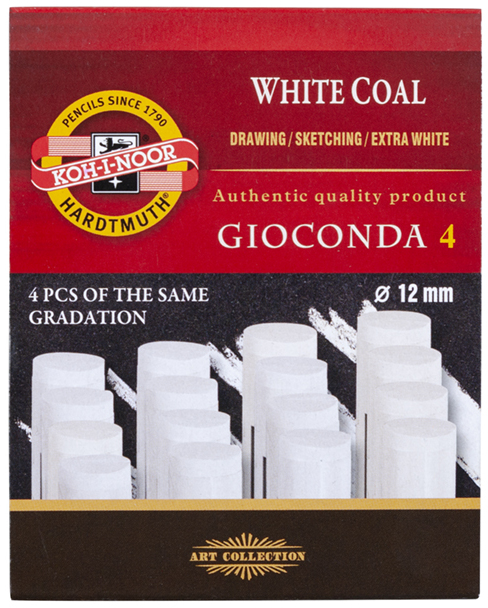 Biały węgiel prasowany. Doskonały do swobodnych, ekspresyjnych prac graficznych i szkiców niewymagających odwzorowania wielu szczegółów. Sprawdza się w rysunkach na dużych formatach.- Gioconda biały węgiel prasowany - Zestaw zawiera 4 sztuki węgla w twardości 2
