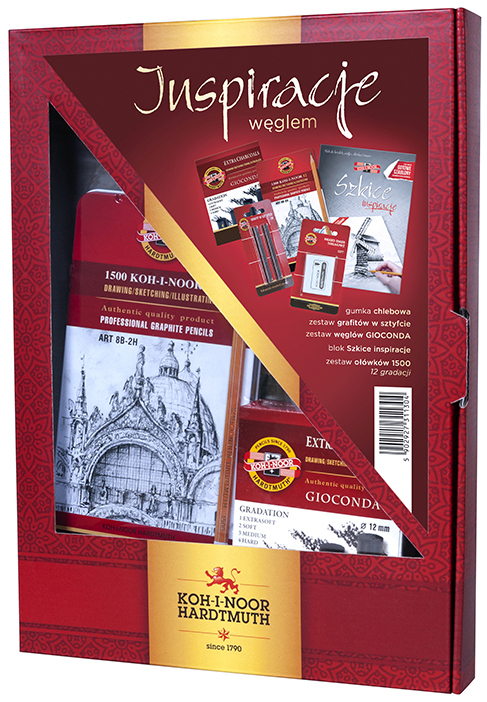 W skład zestawu wchodzą: zestaw ołówków 1502/II, grafit w sztyfcie 4390/2B/bl, zestaw wegli prasowanych 8694, gumka oraz blok „szkice inspiracje“.- Zestaw prezentowy artystyczny spakowany w ozdobne, kartonowe pudełko číst celé