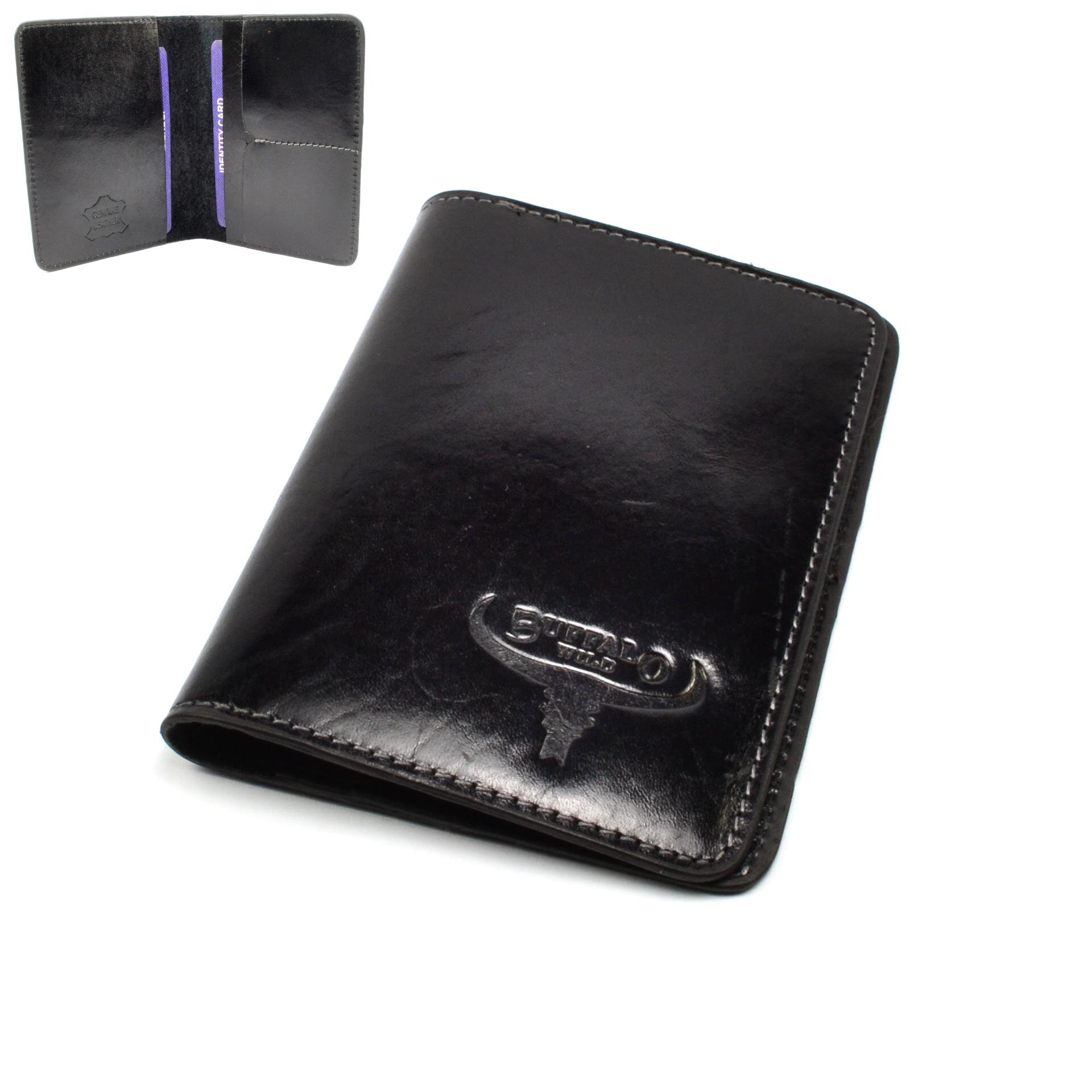 Kožené pouzdro na doklady - dokladovka. Pouzdro má několik kapes na doklady a platební karty na boku pouzdra. Pouzdro má černou barvu a je vyrobené z pravé kůže. Pouzdro je značky Buffalo Wild.
