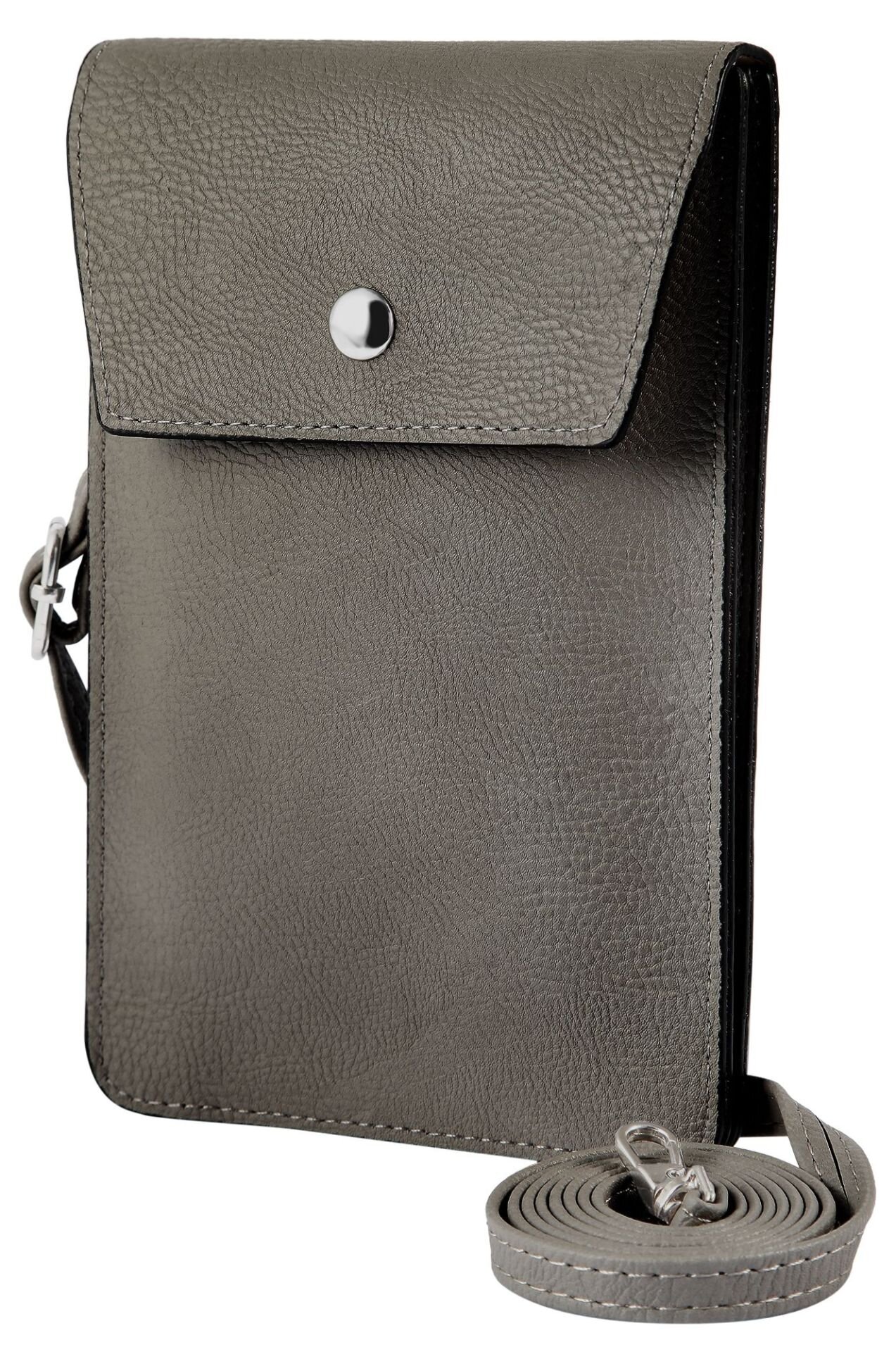 Kožené pouzdro na krk na doklady je vyrobeno z umělé kůže šedé barvy. Pouzdro má koženou šňůrku s nastavitelnou délkou až 125 cm. Na konci jsou karabinky a tak ji lze odejmout úplně. Pouzdro má jednu velkou kapsu která se uzavírá magnet přes celé pouzdro, která je rozdělena do dvou přihrádek, které lze snadno otevírat a zavírat pomocí patentního knoflíku. Nabízí dostatek prostoru pro uložení všeho, co potřebujete, a je vhodná i pro velké telefony, jako je iPhone 12, iPhone 12 Pro a iPhone 12 Pro Max.