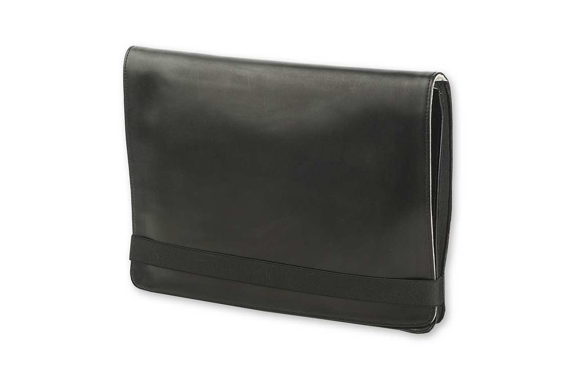 Pouzdro na notebook v imitaci drobně strukturované kůže, doplněné pružným materiálem po stranách. Inspirované designem zápisníků Moleskine, včetně pružné pásky. Uvnitř kontrastní béžová podšívka. Vhodné pro tablety velikosti 13. Rozměry 32,5 x 23 x 3 cm. číst celé