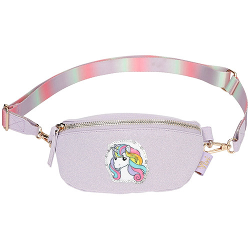 Mini ledvinka Ylvi, Fialová s flitry, motiv jednorožce, duhové poutko