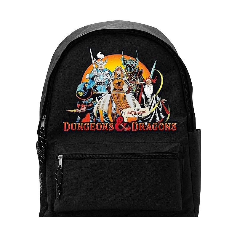 Praktický batoh pro všechny dobrodruhy a hráče oblíbené hry na hrdiny Dungeons and Dragons pojme vše potřebné pro vaše dobrodružství, ať už se chystáte na herní sezení nebo třeba na výlet. Batoh má polstrovaná záda a nastavitelné popruhy, součástí je přední kapsa na zip a síťovaná kapsička na láhev na boku.