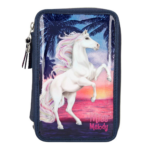 Praktický třípatrový školní penál vyrobený z kvalitního materiálu odolného proti běžnému opotřebení. Jedinečná náplň penálu nabízí - 2 tužky, 18 pastelek, 18 fixů, nůžky, lepidlo, pravítko, ořezávátko, gumu a kapsičku.Penál nabízí dostatečný vnitřní prostor postačující potřebám mladších i starších školaček.Spolehlivé bezporuchové zapínání na zip a originální stylový design značky Miss Melody vytvořily z tohoto penálu oblíbenou školní pomůcku.Materiálové složení: 100% polyester.Rozměry penálu: 20 x 13 x 7,5 cm.Vhodné pro dětiod 3 let.