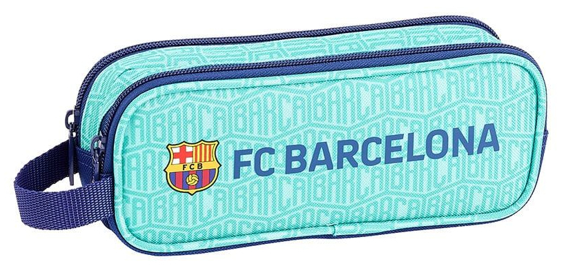 Penál na tužky v tyrkysové barvě vyvedený se znakem klubu FC Barcelona. Penál má dvě přihrádky na zip a přívěsky usnadňující jeho otvírání.