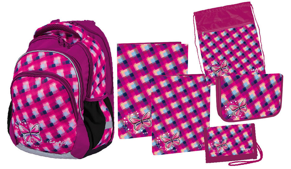 Školní set obsahuje: školní batoh Junior, Box A4, box A5, penál 1 - zip, sáček na cvičky, peněženka na krk. Popis jednotlivých položek setu: 1. Školní batoh - kvalitní, ergonomicky tvarovaný odlehčený školní batoh je vybaven reflexními prvky a anatomicky tvarovanými zády s pevnou konstrukcí. Vnitřní uspořádání batohu: Skládá se ze 3 prostorných komor opatřených pevnými zipy a přední kapsy pro uložení drobných předmětů. Hrudní pás - pro optimální rozložení zátěže na zádech s možností nastavení popruhů dle výšky dítěte. Při celkových rozměrech v420 xš 320 x h200 mm váží batoh pouhých 0,6 kg. 2. Box na sešity, knihy a další školní pomůcky ve formátu A4. Boxy jsou laminované, lesklé s gumou. 3. Box na sešity, knihy a další školní pomůcky ve formátu A5. Boxy jsou laminované, lesklé s gumou. 4. Školní penál jednopatrový, prázdný s dvěma chlopněmi, o rozměru š.195 x v.35 x h.130mm 5. Školní sáček na cvičky vhodný pro žáky 1. stupně ZŠ vyroben z pevného, kvalitního materiálu. Rozměr sáčku na přezůvky 440 x 320mm. 6. Školní peněženka na krk o rozměru 126x80mm se šňůrkou s plastovým bezpečnostním uzávěrem. Zapínání na suchý zip, 5 vnitřních kapes, v zadní části je průhledná kapsička na průkazku. Materiál je voděodolný.