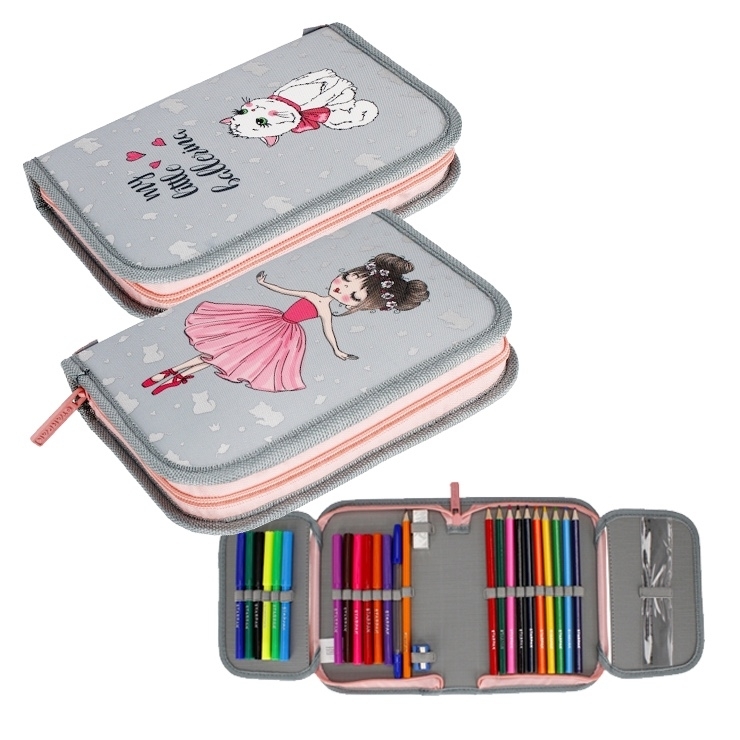 Plně vybavený penál se 2 křidélky a flexibilními držáky na školní potřeby, zapínaný na pevný zip.