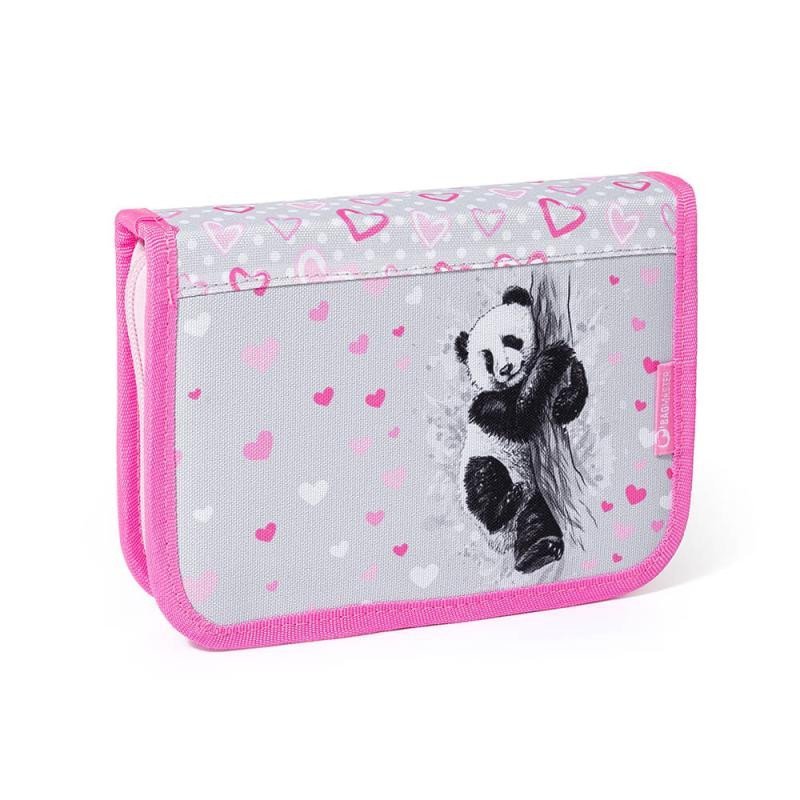 Školní penál pro holky, dvouchlopňový se spoustou gumiček, motiv panda. číst celé