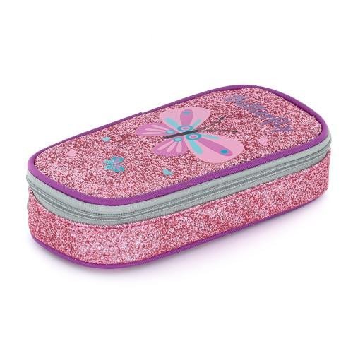 Školní pouzdro etue s motivem motýla se třpytkami. Pouzdro je opatřeno pevnými zipy, kapsičkou na zip a klopou s pevnými poutky po obou stranách. Pod klopou je místo pro volné uložení psacích potřeb nebo jiných drobností. Rozměry: cca 20,5 x 10 x 5 cm