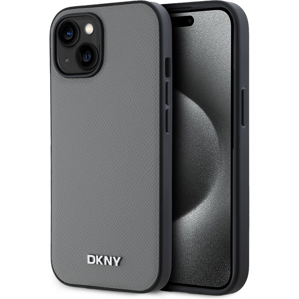 DKNY PU Leather Silver Metal Logo Magsafe kryt iPhone 14 šedý