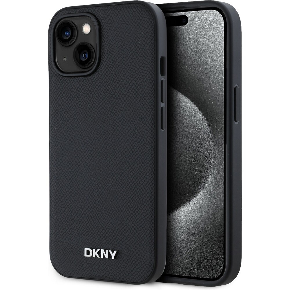 DKNY PU Leather Silver Metal Logo Magsafe kryt iPhone 15 černý
