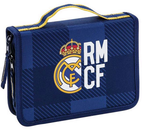Oficiální školní pouzdro a doplňkové zboží z katalogu papírenských produktů se znakem a grafikou v klubových barvách slavného španělského fotbalového klubu Real Madrid.