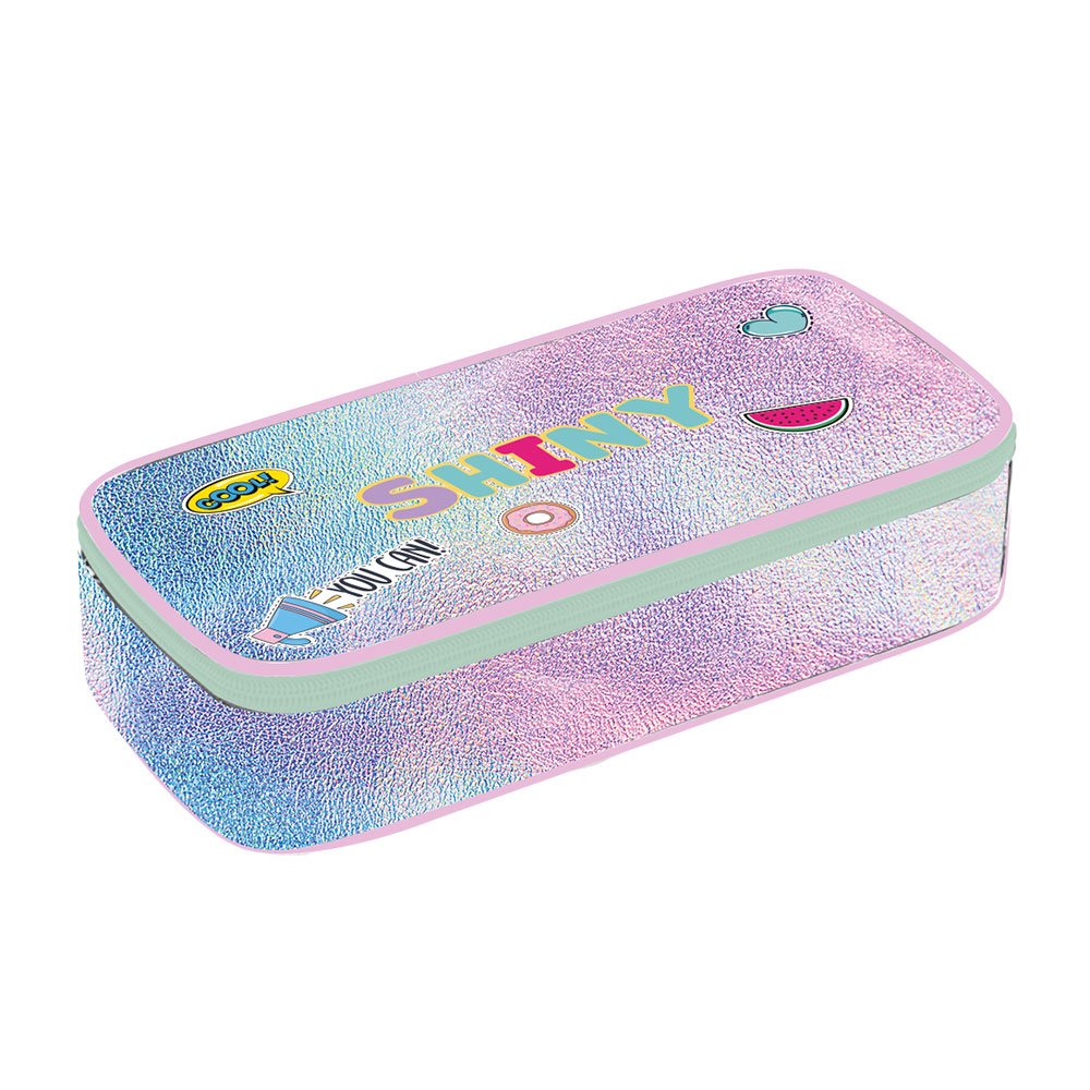Školní pouzdro etue s lesklým motivem. Pouzdro je opatřeno pevnými zipy, kapsičkou na zip a klopou s pevnými poutky po obou stranách. Pod klopou je místo pro volné uložení psacích potřeb nebo jiných drobností. Vhodné pro školáky na 2. stupni a starší studenty.