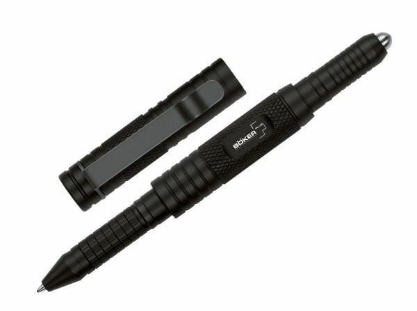 Inovatívne taktické pero Böker Plus Tactical Pen Black 09BO090 z ľahkého stabilného eloxovaného hliníka čiernej farby, ktoré má na konci tvrdú zaoblenú vložku z nehrdzavejúcej ocele, ktorá umožňuje pero využiť aj ako kubotan.