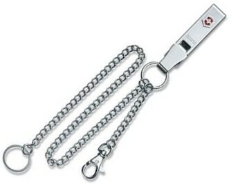 Kovový klip Victorinox Belt-Hanger na opasok s karabínou so zatláčacím mechanizmom na retiazke a jednou samostatnou retiazkou s krúžkom na kľúče.