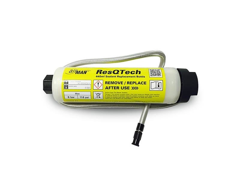 Náhradní těsnící náplň 440ml pro automatickou opravnou sadu Airman ResQ Tech. Náplň je tvořena vodní bází s mikrovlákny a bezpečně opraví průpichy pneumatik, způsobené ostrými předměty až do průměru 6 mm.