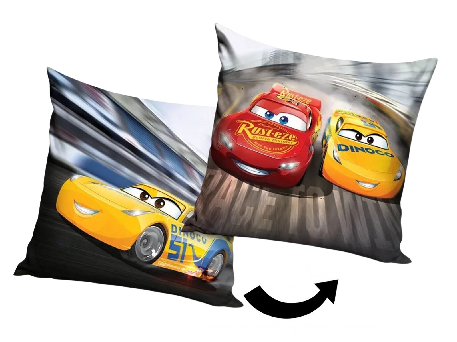 Oboustranný povlak na polštářek.Dezén: Cars Blesk McQueen a Cruz Ramirez.Zapínání: zipRozměr: 40x40 cmMateriál: 100% polyesterGramáž: 190g/m2Praní: 30°C
