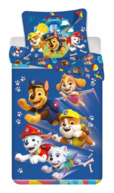 Bavlněné povlečení Paw Patrol na modrém podkladu přímo láká do postýlky.
