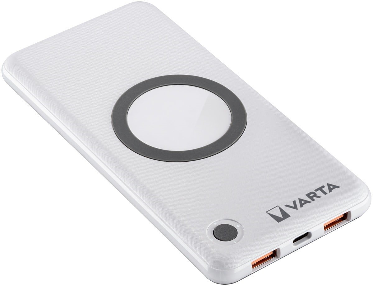 Varta powerbanka s kapacitou 10000mAh a bezdrátovým nabíjením a dvěma výstupy pro nabíjení až dvou zařízení současně. Powerbanka nabízí dva USB výstupy a jeden USB-C, který slouží zároveň pro nabíjení samotné powerbanky. Na místě vyznačeném kruhem najdete bezdrátovou nabíječku, stačí jen položit telefon s funkcí bezdrátového nabíjení a nabíjení bude zahájeno. Oba USB porty disponují nabíjecím výkonem až 18W který je pro oba porty společný. USB-C disponuje stejným nabíjecím výkonem a slouží zároveň pro nabíjení powerbanky. Dále zde najdete LED indikaci, která bude signalizovat jak nabíjení powerbanky samotné, tak signalizaci při nabíjení z powerbanky, Vlastnosti - powerbanka s bezdrátovým nabíjením - kapacita 10.000mAh (3,7V; 37Wh) - nabíjecí výkon až 18W (USB Typu C PD) - výkon bezdrátové nabíječky až 10W (7.5W / 5W) - USB-C vstup PD: 5V/3A; 9V/2A - USB-C výstup PD: 5V/3A; 9V/2A; 12V/1.5A - USB výstup QC3.0: 5V/2.4A; 9V/2A; 12V/1.5A - LED indikace nabíjení - USB-C nabíjecí kabel v balení - Rozměry 157,5x77,5x15mm - Hmotnost 245g