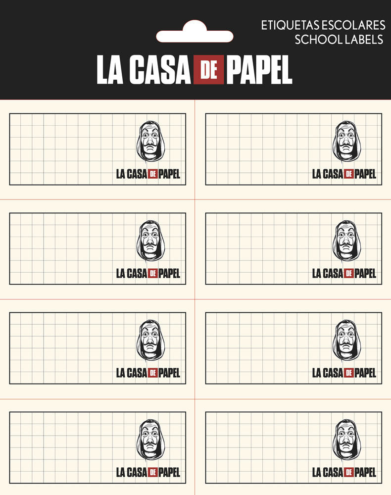 Oficiální nálepky a doplňkové zboží z katalogu produktů s licencí španělského seriálu La Casa De Papel od společnosti Netflix.