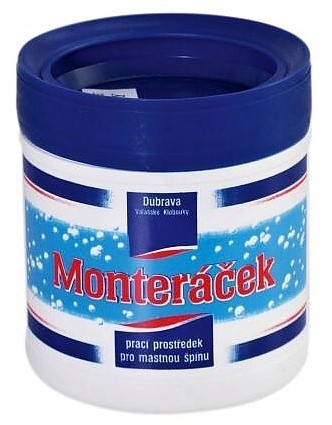 Osvědčený pastovitý prací prostředek pro praní silně znečištěného textilu. Účinná prací pasta na mastnou špínu. Bez vyvářky vypere látky znečištěné tuky a oleji - montérky, pracovní pláště, utěrky apod. i pro použití v pračkách. Montéráček odstraňuje silnou nečistotu, špínu a mastnotu z tkanin již od teploty 60°C. Pere bez vyvářky montérky, utěrky, pracovní oděvy a jiné tkaniny silně znečištěné tuky a oleji.