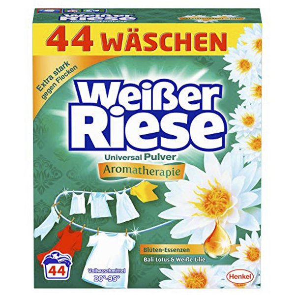 Speciálně parfemovaný prací prášek Weisser Riese Aromatherapie je pro milovníky krásných a jemných vůní květin. Tento prášek je vhodný na univerzální praní bílého a stálobarevného prádla a je inspirován vůněmi Bali. Prací prášek je koncentrovaný a obsahuje formuli pro ochranu vláken a optické zjasňovače, které dodávají prádlu kráně bílou barvu bez poškození tkanin.