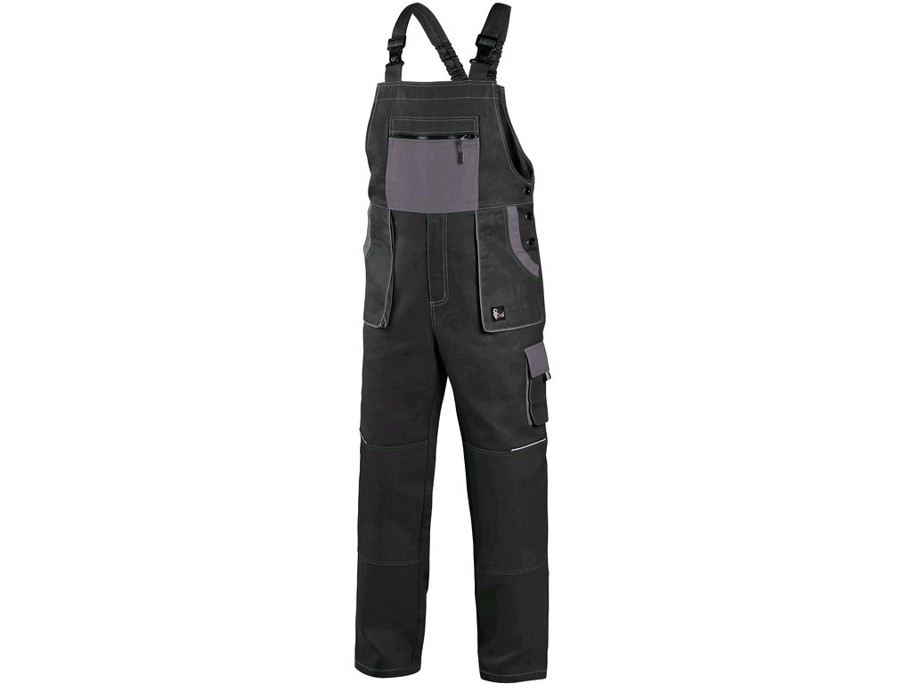 Pánské montérkové kalhoty s náprsenkou, náprsní kapsa na zip, pas vzadu do gumy, přední kapsy, boční kapsa na svinovací / skládací metr, boční kapsa na mobil / peněženku, zdvojená kolena, zadní kapsa s klopou, šle s gumou vzadu, reflexní doplňky.Do číst celé