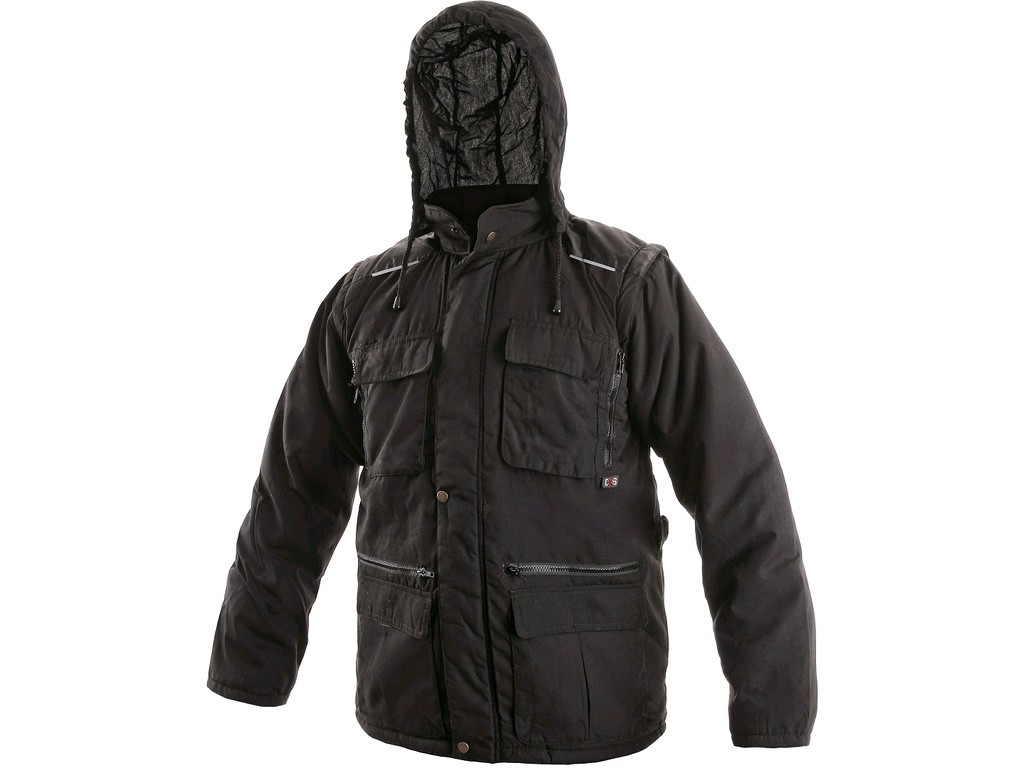 Zateplená bunda, kapuce v límci, zesílená ramena, odepínací rukávy s pružnou manžetou, stahování v dolním okraji, 14 kapes.