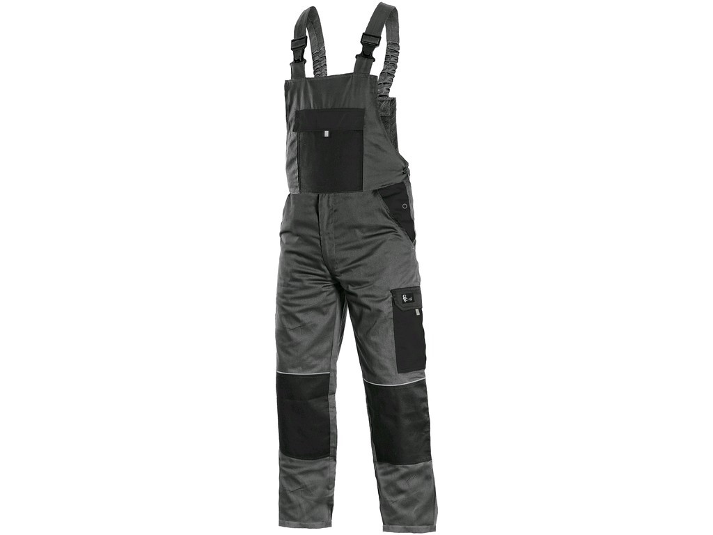 Pánské montérkové kalhoty s náprsenkou, náprsní kapsa s klopou, přední klínové kapsy, kapsa na skládací/svinovací metr, boční kapsa s klopou, zadní jednoduchá kapsa, zdvojená kolena, šle vzadu do gumy.