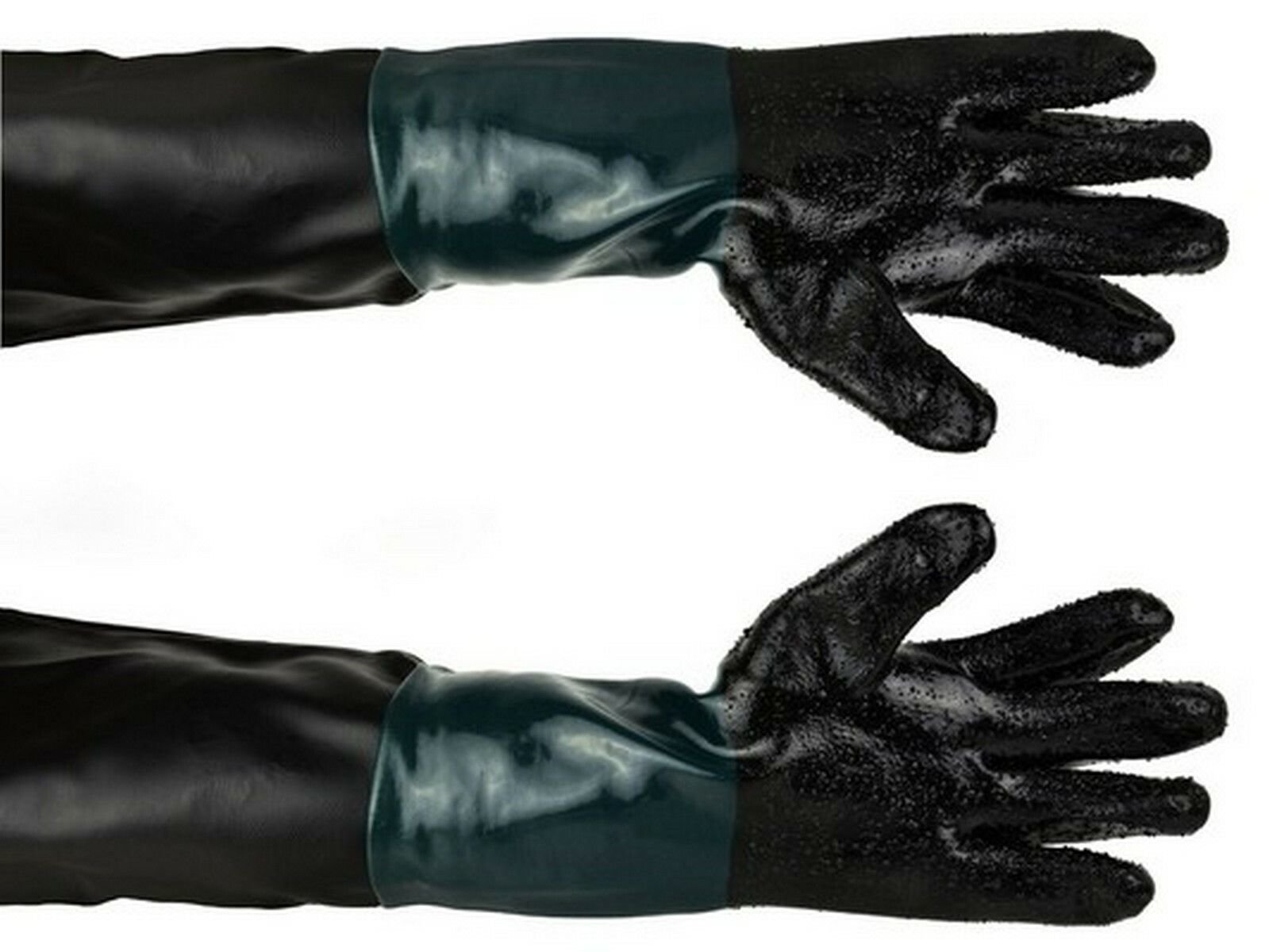 Rukavice pro pískování z pryže, vinylové a umělé kůže. Drsná pracovní část umožňuje spolehlivější uchopení obrobku. Vlastnosti produktu