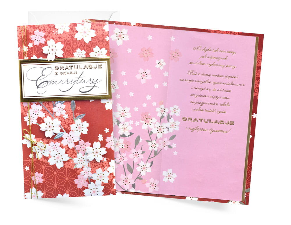 Kartka z okazji Emerytury z serii Passion Moments PM-410 Każda kartka w kolekcji Passion Moments to małe arcydzieło - wyjątkowe i niepowtarzalne, piękne wizualnie. Kartki PM są bardzo bogato zdobione, a jednocześnie skromne i stylowe, cały efekt tkwi w detalach i doskonałym wykonaniu. W zależności od wzoru, na kartkach znajdują się dekoracje ze złotej, srebrnej, perłowej lub holograficznej folii, a także doklejki biżuteryjne, kokardki, laserowe wycięcia, wstążeczki i inne dodatki. Wnętrze karnetu to zawsze atrakcyjna grafika i tekst życzeń. Kartki mają w komplecie dopasowaną kopertę. Cechy szczególne: zdobienie: przynajmniej dwie folie (metaliczne/perłowe/holograficzne), elementy doklejane, wycięcia laserowe, wstążeczki - w zależności od wzoru, wnętrze: z delikatną grafiką, wyjątkowe życzenia w środku, w komplecie: dopasowana kolorystycznie koperta, wymiary karnetu po złożeniu: 11,4 x 21,5 cm. okazja: Emerytura