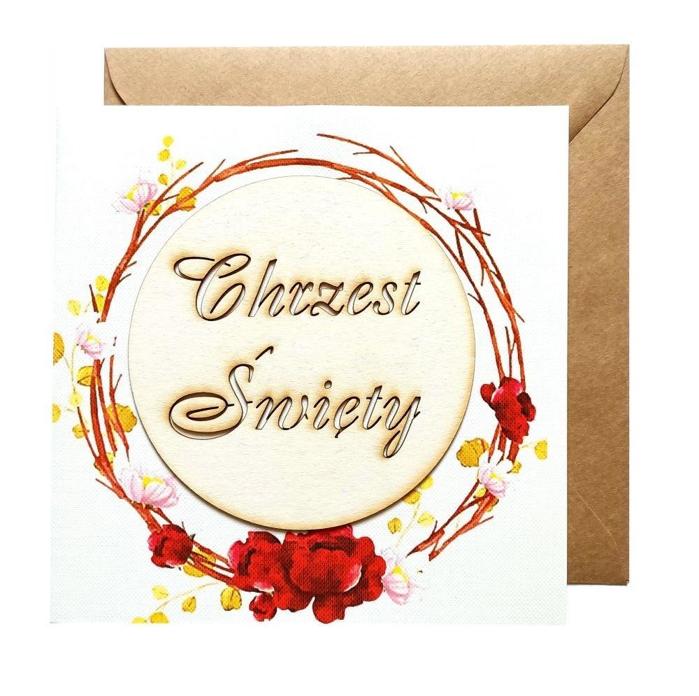 Kartka okolicznościowa z okazji Chrztu Świętego o treści: W podróży przez życie niech Cię zawsze Pan Bóg chroni i mocą Chrystusa przed pokusami obroni. Kochaj rodziców, by pociechę z Ciebie mieli, by radość w Tobie widzieli. Pamiętaj, że Bóg patrzy na Ciebie. W Dniu chrztu Świętego