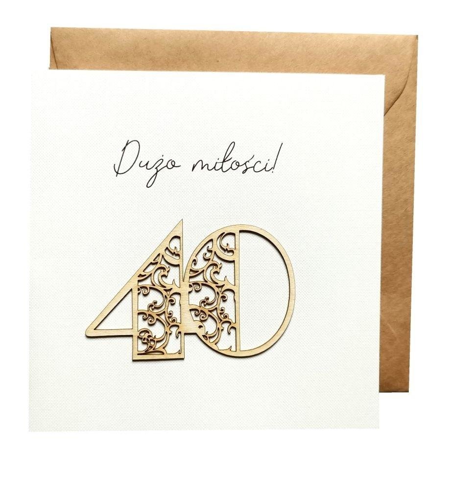 Kartka okolicznościowa z okazji urodzin o treści: Z okazji 40 - stych urodzin najserdeczniejsze życzenia, aby każdy następny rok przynosił wszystko to, co w życiu najpiękniejsze. Zdrowia, szczęścia, niewyczerpanych pokładów wiary i spełnienia marzeń.