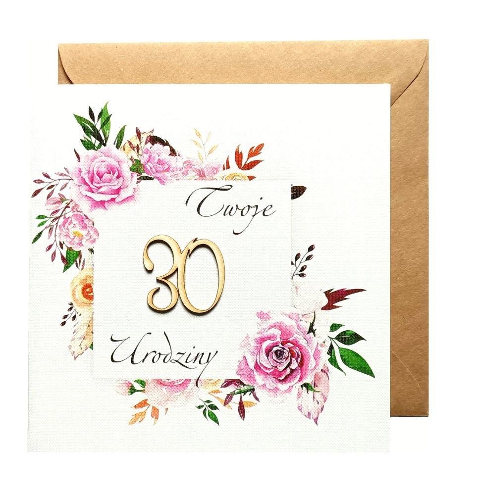 Kartka okolicznościowa z okazji urodzin o treści: Z okazji Twoich 30 urodzin życzę Ci: Aby jedynymi łzami, które pojawią się w twych oczach,Były kryształowe łzy szczęścia Aby radosnego uśmiechu na twej twarzy, Nie zakryły ciężkie chmury smutku Aby płatki róż wyścielały drogę twego przeznaczenia A szczęście, zdrowie, radość i miłość były przeznaczeniem twych dni. Z najlepszymi życzeniami..."