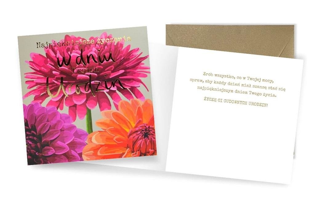 Kartka z serii Quadro to idealny pomysł na piękną pamiątkę. Każda kartka QRP zdobiona jest złotą folią oraz wyróżnia się przepięknym kwiatowym motywem na froncie. Środek kartki posiada specjalnie dopasowane życzenia z miejscem na własną dedykację. Całość idealnie dopełnia dopasowana kolorystycznie koperta Cechy szczególne: wielkość: 15.5 x 15.5 cm po złożeniu koperta: dopasowana koperta kraft zdobienia: złota folia okazja: urodziny