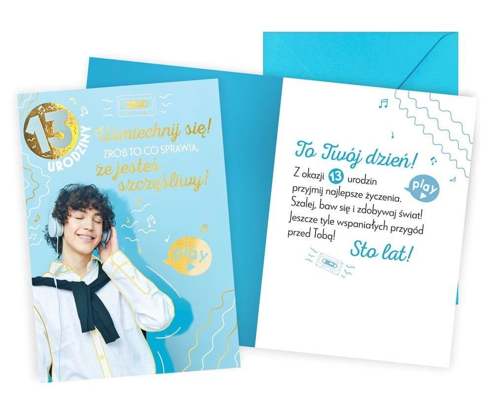 W powiększonym tzw. Angielskim formacie 140x190 mm. Wykonany z niezwykłą dbałością o szczegóły, zdobiony. Wewnątrz znajduje się tekst życzeń, a całość uzupełnia dopasowana kolorystycznie koperta. okazja: Urodziny