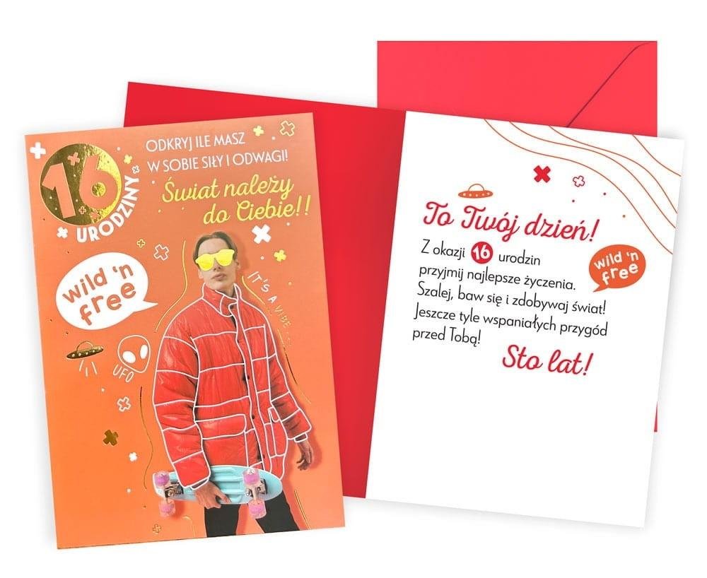 W powiększonym tzw. Angielskim formacie 140x190 mm. Wykonany z niezwykłą dbałością o szczegóły, zdobiony. Wewnątrz znajduje się tekst życzeń, a całość uzupełnia dopasowana kolorystycznie koperta. okazja: Urodziny
