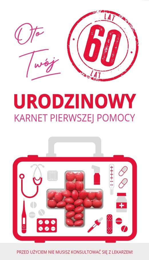 karnet z okazji 60 urodzin z życzeniami, kopertą i humorystycznym dodatkiem w środku. číst celé