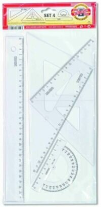 Rýsovací souprava obsahuje 1 x klasické 30 cm pravítko, 2 x trojúhelníkové pravítko a 1 x úhloměr.
