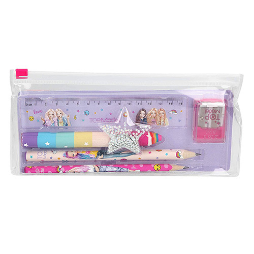 Super cool souprava pro psaní! Neodolatelný dívčí psací set v pouzdře v jedinečném designu značky Top Model. Balení obsahuje dvě tužky, pravítko, ořezávátko a gumu ve tvaru tužky. Atraktivní dárek pro všechny školačky!Vhodné pro děti od 3 let.