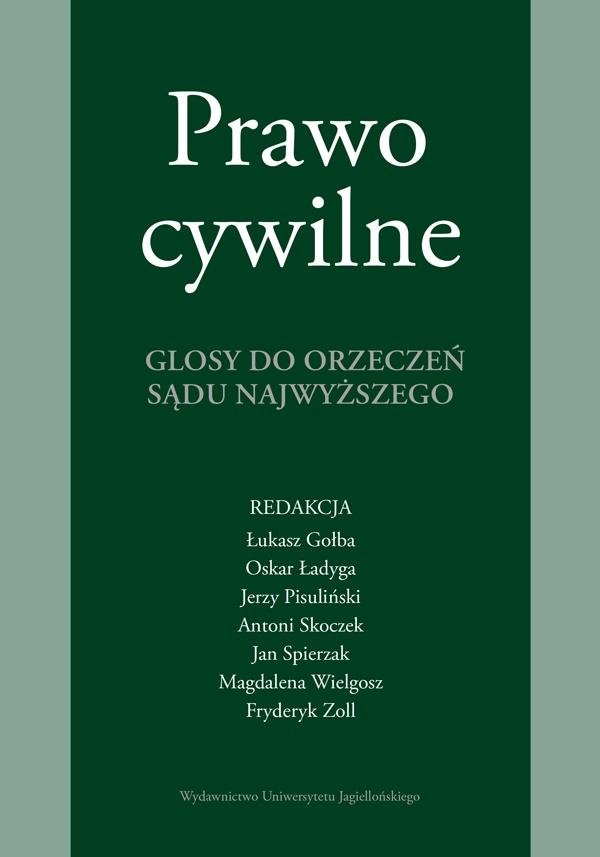 Przedkładany Czytelnikom zbiór glos do ośmiu orzeczeń Sądu Najwyższego stanowi wynik pracy w ramach seminarium magisterskiego prowadzonego przez Jerzego Pisulińskiego oraz Fryderyka Zolla. Glosy dotyczą zagadnień kontrowersyjnych. Nie tylko prezentują stanowiska dotyczące prawa cywilnego, które wymagają pogłębionej dyskusji, ale też ujawniają określony sposób argumentacji Sądu Najwyższego, warty krytycznego spojrzenia i refleksji. Glosy zostały starannie wyselekcjonowane i stanowią wynik pogłębionej dyskusji nad ich kolejnymi wersjami. Pierwsza z glos dotyczy stanowiska sądu w kwestii skutków prowadzenia cudzych spraw bez zlecenia, a kolejne: międzyczasowych zagadnień przedawnienia; przelewu wierzytelności przyszłych; początku biegu terminu przedawnienia roszczeń deliktowych; przerwy biegu terminu przedawnienia; wpływu darowizny udziału w rzeczy na uprawnienia z tytułu rękojmi; uprawnień dłużnika do odstąpienia od umowy oraz możliwości zastrzegania kary umownej w zobowiązaniach pieniężnych; uprawnień dłużnika do odstąpienia od umowy, gdy przedmiot świadczenia jednej strony jest niepodzielny, a zwłoka dotyczy części świadczenia podzielnego. Niniejszy zbiór w pierwszej kolejności ma służyć celom dydaktycznym. Może on być pomocny w organizowaniu zajęć casebookowych, tj. polegających na omawianiu orzeczeń sądowych przy wykorzystaniu tzw. metody sokratejskiej, czy też stanowić podstawę do ćwiczenia ze studentami rozwiązywania kazusów według ustalonej i konsekwentnie przestrzeganej metody. Zbiór ten jednak zawiera także poglądy naukowe, które powinny wzbogacić dyskusję dogmatyczną, a fakt, że został przygotowany przez studentów, nie wpływa w negatywny sposób na jakość prezentowanych w nim stanowisk. Mamy nadzieję, że książka dobrze spełni swoją funkcję.