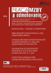 Práca, mzdy a odmeňovanie 5/2015 - Mesačník s bezkonkurenčným počtom aktualít a tipov z personálneho a mzdového poradenstva. Publikácia je zameraná na: sankcie pri neplnení povinností zamestnávateľa v oblasti mzdového účtovníctva. Dovolenka v roku 2015 - Otázky odpovede. Oznamovacie povinnosti poistenca na účely RZZP za rok 2014 do 31. 5. 2015. Prechodné ustanovenia § 252k Zákonníka práce - dočasné prideľovanie zamestnancov. Cestovné náhrady poskytované zamestnancom pri zahraničnej pracovnej ceste.